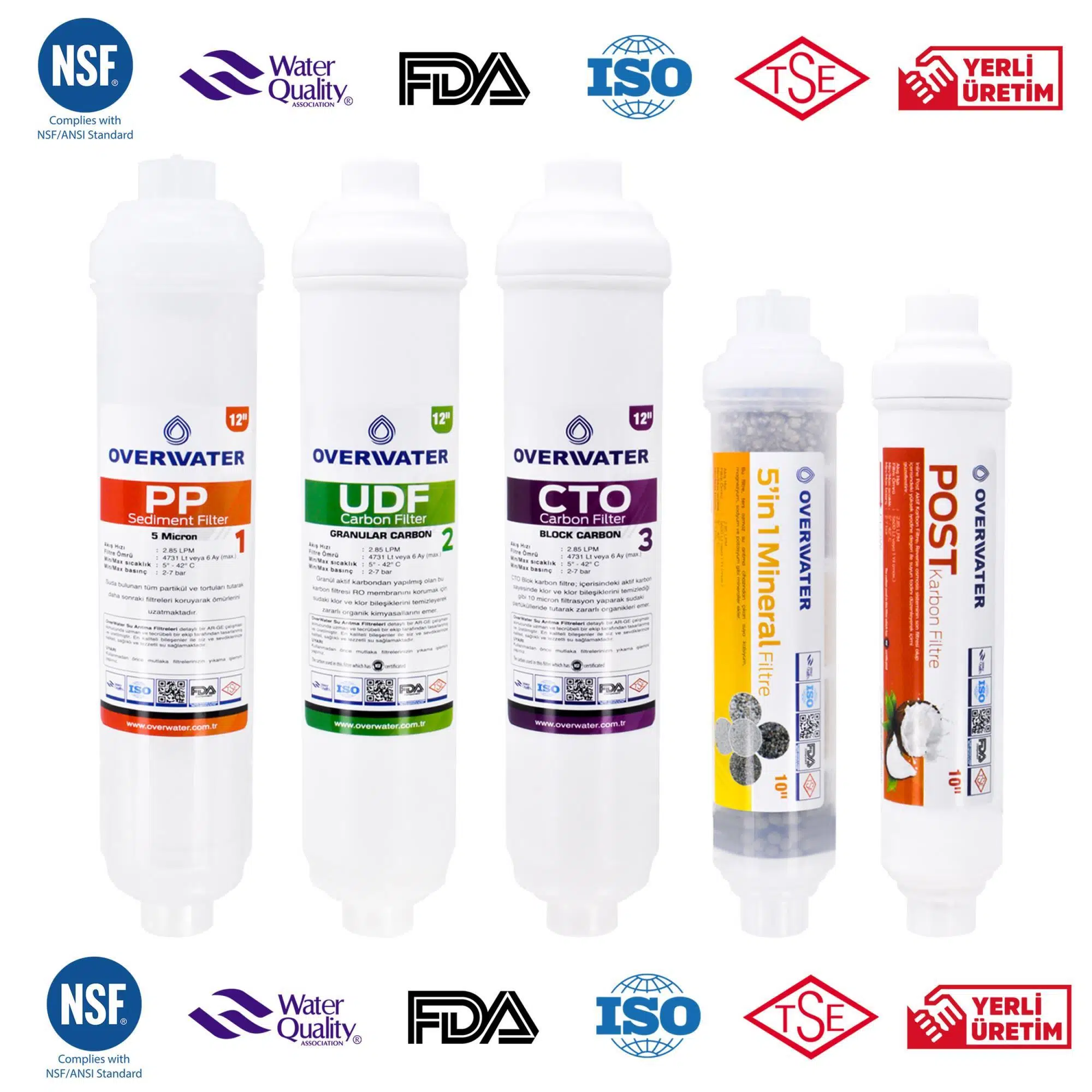 12” Sediment (NSF), 12” GAC (NSF), 12” CTO (NSF), 10” 5’li Mineral ve 10” Post Karbon (NSF) kartuşlar dahildir.